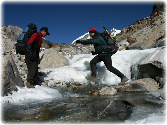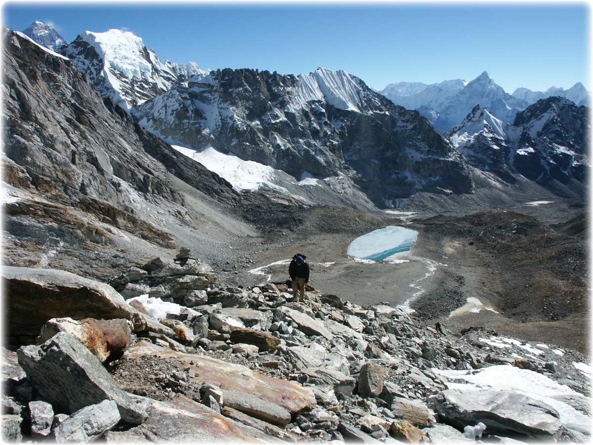 Here Joel crosses a small ridge marked with a chorten in the mid-lower Gokyo valley - Jamie