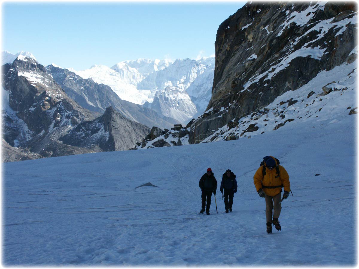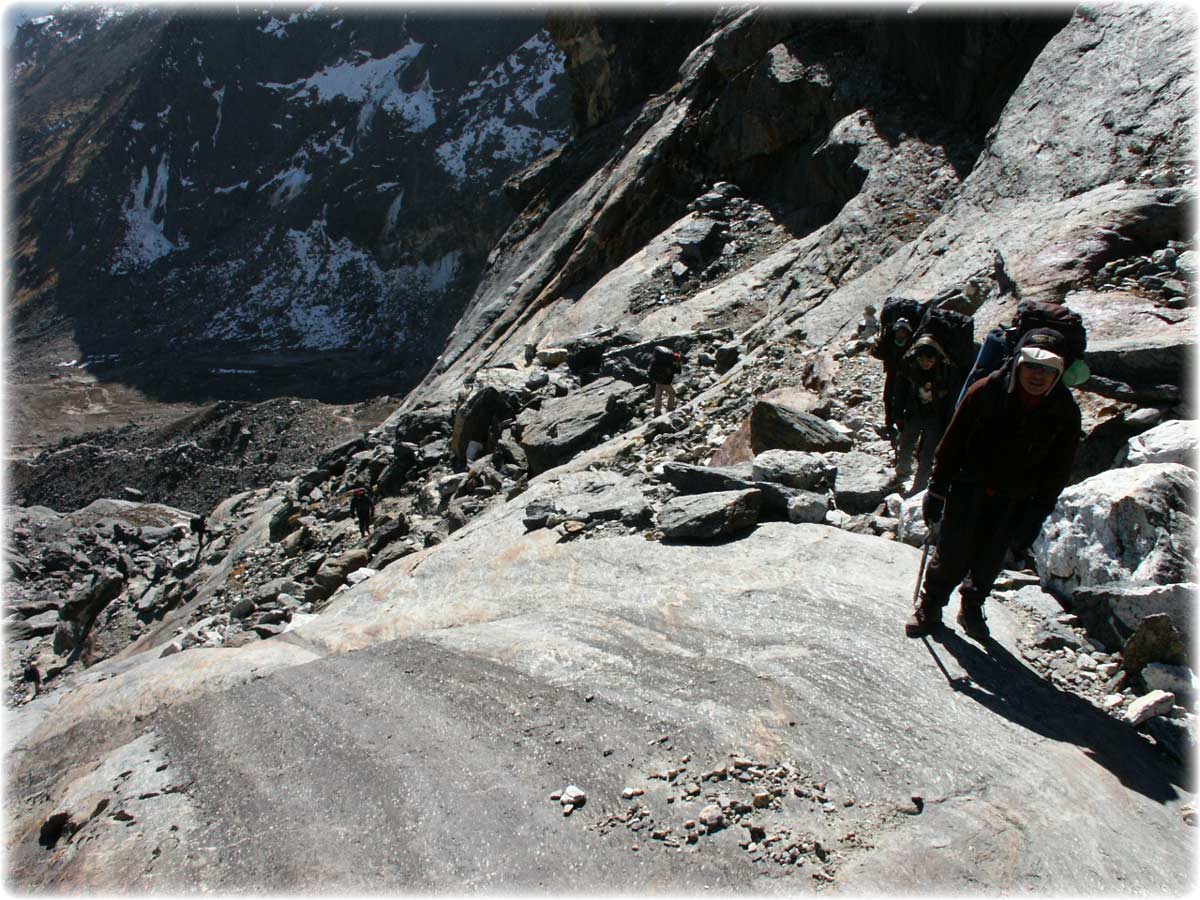 The top section of the Chola is a narrow trail, quite exposed. Don't ever cross the Chola in low visibility or if these rocks are covered in snow - Jamie