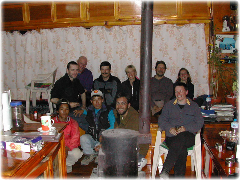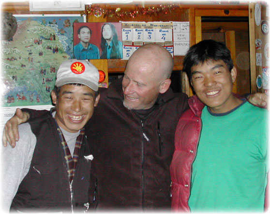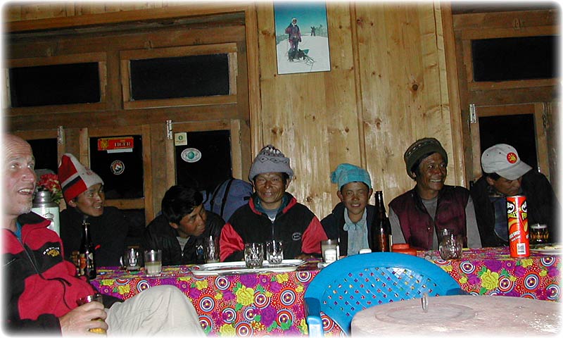 Our porters enjoy a well-deserved beer - great job, guys! Gombu, leaning over on the left, has trekked with me 3 times now, and the two guys to the right of him, twice.