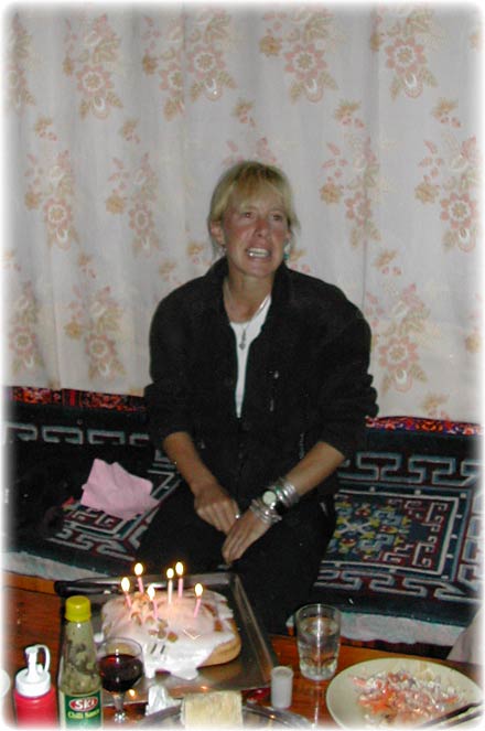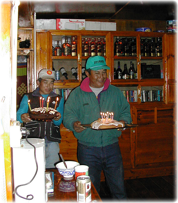 Natang (the Namche Moonlight lodge owner) and Ang Dami (our porter leader) bring them in - and the result... Oh yes, it was Kim's birthday (earlier it was Joel's and Jamie's too, all on the same trek - it is worth coming on our December trek for all the extra cakes alone!)
