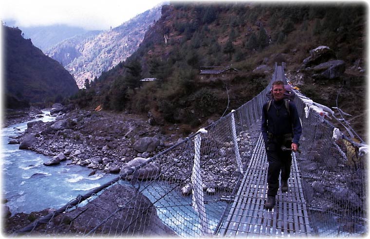 The bridges of the Khumbu get better and better, but the Sherpas still tie katas, white ceremonial scarves, to the bridge to help it stay up.