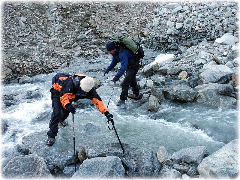 From our base camp first we had to get to the mountain, crossing a tricky stream in several sections - Jamie