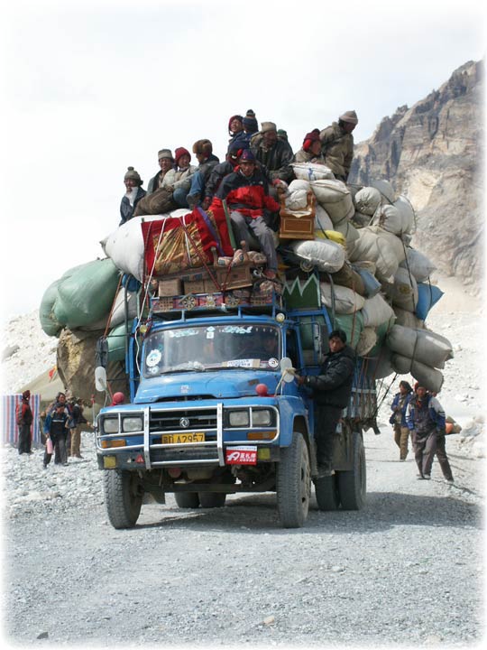 A truck loaded with supplies for a temporary shop and grass for yaks arrives at Everest BC.