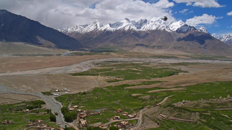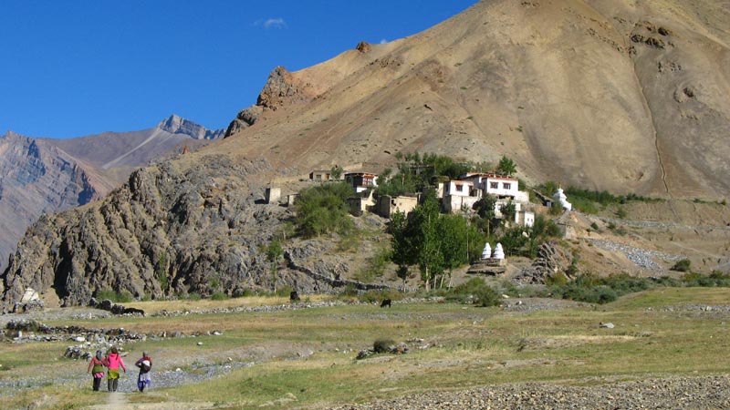 14 - Trek Ichar 3900mWe follow the river along a lovely cliff-side trail with broad views, contouring around the hillsides, first by a small, colorful tea-house across from Cha village and then by two other villages, Kalbok and Surle. Stop for a look back towards Purne and the confluence of the rivers at the large chorten on the trail, and then across the Tsarap Chu to the tiny meditation retreat of Cha, tucked into the cliffs way above the river. This is an ani gompa, or nunnery, with little funding but lots of dedication; we don't recommend the trail on the opposite bank of the river, though. An hour later we should arrive at the few small houses and green fields of (Changpa) Tsetang, and then have to switchback steeply all the way down to a small stream, cross a rock bridge, and then ascend all the way back up. We might have lunch on the rocks near here. An hour of hot, cliff-side walking later we reach the campsite and teahouse of Pepula, climb again, descend to some black beaches on the bank of the river, and reach another pair of large chortens. Look across the river at an old monastery or fort built into the rock face while taking a short rest. After crossing the second Japanese-style bridge, our campsite is right there, over looking the river on a grassy bank just below Ichar village. After about seven hours of trekking, it's a welcome site! ***15 - Trek Ichar Doksa (exploratory)We have plenty of time to explore the fortress-like village of Ichar (35 houses, 300 inhabitants) this morning, so after breakfast and a steep climb past thick mani walls and irrigation ditches up to the village, we'll spend a bit of time watching life go by. From Ichar, we descend down to a small stream with a working barley mill, and then start our exploratory three days of trekking to Stongde up the valley to the right of the village, eventually setting up camp at Ichar Doksa. We've talked about doing this route for years, and only last summer when we trekked a remote valley - the Sum Shade Valley - did we meet locals en route who could confirm that the route from Ichar to Stongde was good and doable all summer. The other side of the valley was so spectacular and remote that we decided we want to check out this route as well!