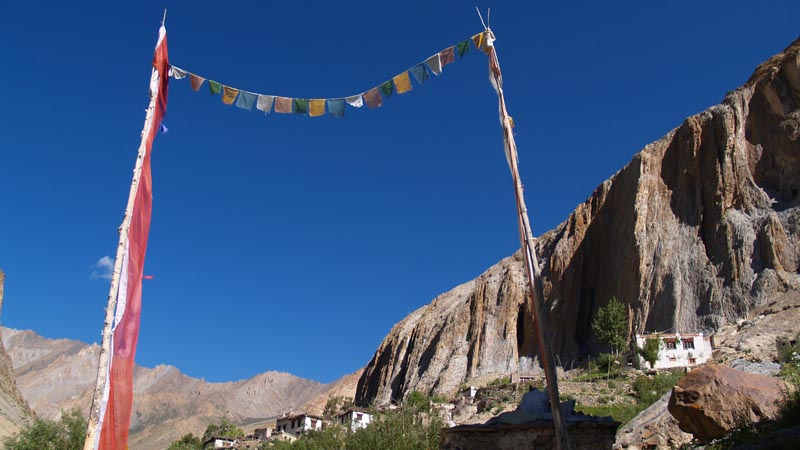 11 - Trek Testa 3950mDon't miss the first rays of the sun filtering through the wood and dung smoke from the Kargyak chimneys as you get ready for breakfast in the morning! Classic Zanskar scenery all around as we trek down valley, past a series of long mani walls and chortens, and then past the white-washed village of Sking (Hi) on the left bank. We will cross the small, wooden bridge and make a detour to the village on the way to Testa, as it's one of Kim's favorite villages in Zanskar, a myriad of activity, friendly villagers, lovely setting. Back down to the river, we'll trek along a sandy trail of rounded river rocks, past the trail leading to the Phirtse La on the right, and eventually reach the large red, black and white chortens leading to Tantse and its patchwork of fields. We'll stop at the small teahouse, owned by our friend Sonam Dorje, for a cup of tea. Above us to the right of the trail is Tantse Gompa, one of the oldest in Zanskar, backed by jagged, dun-colored peaks. Before reaching our lunch-site in a threshing circle at Kuru, we drop back down to the river and cross on the new bridge. The old one has character, but isn't for the faint of heart. It can be a scorching day, so drink lots of water and be ready for it. Another scenic hour of easy trekking leads us to the green fields and labyrinthine village of Testa, another of our favorites. We camp at a wonderful campsite surrounded by old chortens, nearby our friend Tashi, the local the amchi's (Tibetan doctor) house. The village is a lively one, and we'll have the afternoon to explore, or visit with the kids who will be at camp to see what's happening ... 12 - Trek Purne 3840mOnly a three hour day today, starting with a gradual climb to the Zanskari village of Yal, where fodder and kindling dry on the rooftops, and then along a great, high trail overlooking the Kargyak Chu, now much larger. Descending back down to the river, we trek along side of it, not crossing the first wooden bridge to our right but continuing back up to the high trail. Look across the river at the old trail cut into the cliff-side! A steep, sandy descent leads to our bridge over the Kargyak Chu, after which we follow the trail back up to our campsite at Purne. It's good to start early to beat the sun and arrive at the shaded oasis of Purne in time for a shower and to do some clothes washing. Our good friend, Dolma, also an amchi, runs the showers and one of the campsites, and her shop has ample supplies of cold beer and soft drinks. We'll have lunch under one of the shops shaded awnings, and wait for the horses to arrive to set up camp. Enjoy the afternoon, and the wonderful sunsets ... For those with energy to spare, climb to the 'lhatoo' with prayer flags above the village for a view down on camp and the intersections of the Tsarap Chu with the Kargyak Chu. 13 - Purne (trek to Phuktal Gompa)The spectacularly perched Phuktal Gompa, a two hour walk up a narrow gorge on exposed trails, is one of the oldest sites in the Indian Himalaya with a large community of monks. The easy hike out tot he gompa is also a beautiful one, so everyone should really try to make it. Phuktal Gompa has a school attached to it, and the young, lively monks are always keen to practice their English, or to have a photo taken. The gompa itself is a real Central Asian treasure, with ancient prayer rooms, an old library, a fountain with magical waters in the original cave, a Tibetan medicine center, a wonderful kitchen and many old friends. Singge, the young Zanskari boy that we sponsor, stayed a few years at this gompa before being 'evicted' for bad behavior! Back at camp, lunch is waiting, and you'll have the afternoon free for a shower, a nap, some laundry, a beer, whatever ...