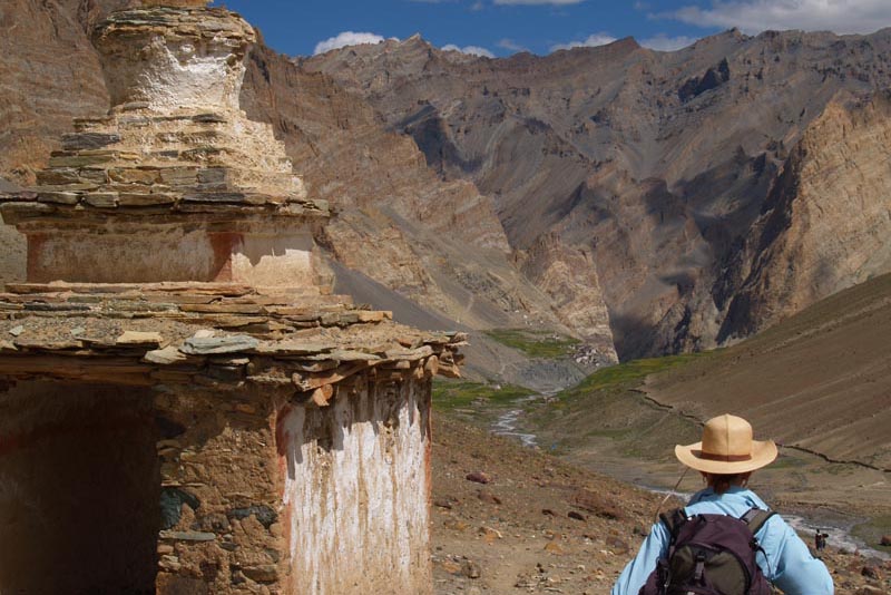 17 - Trek Stongde 3600mIt will be a long and tough but spectacular day, so we'll set off early in the morning towards the Stongde La, keeping mostly to the left of the river and eventually climbing high above the river towards the pass. The scenery en route is breath-taking as we climb from the willows by the river above a high gorge, and the ranges open up around us. It should take us about four hours up, and about two hours down, past the Stongde 'doksas' to Stongde Gompa, where we will take a break. Stongde Gompa is dramatically set in an open birch wood, large, white chortens leading to the inner courtyard. If our friends Geshe Lobsang or Geshe Stenzin are at the gompa, we'll certainly be invited in for tea. Those who are interested can stay a bit and catch the evening puja (4:30 - 6:00pm), a timeless ceremony of drums, horns, bells and resonating chanting. There is also an ancient prayer rooms with all sorts of treasures from the past, really worth a browse. Look back towards Padum for breathtaking views of the green patchwork of Stongde village, and back to the Himalayan barrier. We have now entered what was once the ancient Kingdom of Zangla, and we are heading towards the capital, Zangla itself; the kingdom is bordered by the Zanskar and Himalayan ranges, and the five hundred year old monasteries that testify to its antiquity dot the valley rim. And from the gompa roof, there is an incredible view back towards the Stongde La, now about 1000 meters above us! It's a quick, steep descent down to Stongde, a village of about 80 households, of which many men have been in the Indian Army; and by this time we hope the horsemen and our staff have gotten camp set up and tea ready!