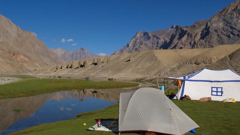 6 - Trek Zanskar Sumdo 3940mSumdo means river junction, and the junction that we head for today leads to our destination, Zanskar. We'll have a five hour trek today which you should feel, as we're getting close to 4000 meters. The trail first passes some fields of peas, often flowering, and barley, intersects the new road a few times, and then snakes up and down the scree-fields on the side of the hills to our right and along grassy, rocky plateaus. There will be two river crossings today, and if it's been a winter with heavy rainfall, expect to need sandals and perhaps your trekking poles. For glacial valley lovers among you, today's walk will be a classic, as will tomorrow's. We set up camp at the far end of Zanskar Sumdo, along a grassy section of the tiny stream, spring water, as scenic a campsite as any. 7 - Zanskar SumdoA rest day for acclimatization, so if you feel like a walk, Kim will help orient you. If you want to rest, it's a good idea; don't feel like you have to do anything besides head in and out of the dining tent or catch up on your reading today. IF everyone is feeling fine, we might consider skipping this rest day and using it later in the trek, but we'll make that decision at ZS. 8 - Trek Gaddi Tach 4515mHeading further up the valley towards the Shingo La, the gateway to Zanskar, we start the day with a rickety bridge crossing and a small but steep climb up the narrow valley banks. As we climb towards the base of our first pass, we see our first real snow-peaks looming above us in the distance. As usual, it is important to trek slowly today, as we are ever gaining altitude; and of course to drink lots of water and stop and rest when your body tells you to. There is no pressure to go fast or to walk as a group; we have adequate staff to spread our group out, and take our time. Look out for grazing sheep and local shepherds en route. We camp at Gaddi Tach, a basic campsite an hour or so below the 'high camp' and near the base for climbing Ramjack Peak.