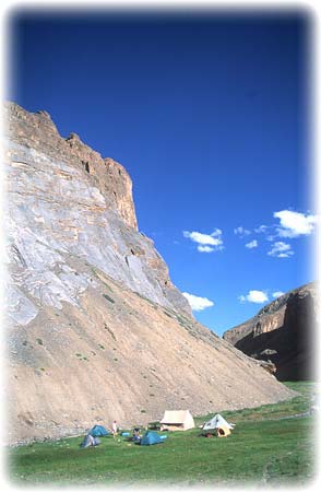 This is a very old itinerary, see Our treks for all the trips running. Himalayan CaravanRugged, colourful gorges contrast with the azure rivers and spacious valleys, all classic Ladakh trekking, as good as it gets. The Changthang is the name given to the captivating high mountain plateaus of Western Tibet, an area which sits at an average elevation of 4500 to 5000m. This remote and fabled region is peopled by Changpas, the traditional traders of the Changthang, who have wandered these high pastures with their Gurs (nomad tents) and flocks of pashm goats and sheep for centuries. This traditionally Tibetan region lies in part in the Indian Himalaya, although the culture remains purely Tibetan. This trek is a unique experience; a journey in time during which we witness a way of life that has not changed for centuries. It is a true journey in the classic sense, traversing remote passes to visit remote people. Essentially we are trekking into the ancient Tibetan Kingdom of Guge, home of the Bon religion which predates Buddhism for hundreds of years, and we emerge into a part of the present day Indian Himalaya. Project-Himalaya has been trekking this remarkable area since it opened in the late 90s, with our Tibetan Sirdar, Lobsang, a Changpa himself, from a Nomadic family. We are Himalayan experts and professional guides and our treks are motivated by a deep love and respect for the peoples and regions of the Indian Himalaya. ![]() Preparation and trekking with usThere is lots of India trek and preparation information on the left. Also take a look at About us and at the photo galleries to see why we rave about Ladakh and Zanskar. The itineraryNote that most flights into Delhi arrive late at night/very early in the morning. Plan your arrival time-date carefully and ask if you are not sure. The Caravan is a shorter version of this itinerary (ie the Extended Caravan). The Caravan 50 joins after the first 10 days of trekking. Join this longer trek if you can! Logistically what will happen is Joel will meet and handle the trekkers for one of the trips, the one with most of his friends on then Jamie and Nicola will handle the Delhi-Leh section for the others and then we will all be trekking together. The smart will also realise that we are running an exploration trip at the same time - these people are also trekking with us and while Joel will continue with the trekkers, Jamie and Nicola will head off with the exploratory team. It is likely that at the end of the trip we will all meet in Manali again to party and exchange stories. ![]() Day 1 - arrive DelhiJoel, Kim or a representative will be at the airport to meet you and take you to the atmospheric Metropolis Tourist Home in Paharganj, near Connaught Place in central Delhi. day 2 - fly Leh 3500mDid you get any sleep? We are early to board the spectacular flight to Leh, crossing the main Himalayan Barrier to the capital of Ladakh, Tashi Namgyal's 15th century Himalayan capital at 3500m. The clear high air will catch at the throat when we arrive, and now we start the serious business of acclimatization; and eating, as after we settle into our hotel we have a long leisurely breakfast It will take your body a few days to adjust to this high altitude. It is important to drink plenty of (non alcoholic) liquids, and do not attempt to rush around. Even walking up the stairs of the guest house will make you breathless at first! We will discuss this in detail. Note that we have planned plenty of acclimatization time into our itinerary. Day 3 - Leh 3500mWe have 2 days to explore the bazaars and alleyways of historic Leh, and the striking Indus valley which surrounds it, visiting some of the most ancient forts and Gompas of the Tibetan Buddhist world. Day 4 Leh 3500mAnother day for relaxing and enjoying the peaceful atmosphere. All gear duffels should be packed and ready for a 6 am start tomorrow, which is when our crew, (not us!) head off to meet the ponies and set up the camp site. 5 - Shang Sumdo 3660mA post lunch drive through the beautiful Indus valley brings us to the hamlet of Shang Sumdo, where our crew has set up camp amongst an idyllic grove of willows at the sumdo (river junction). Here we meet the other vital component of our trek, Tsarap and his team of mules and horses. 6 - Chukirmo 4070mOur first days trek is an easy one, as we climb slowly to 4000m along the river valley. Today you will feel the elevation, and the summer heat, so it is important to walk slowly, wear a hat and lots of sun block. Chukirmo is the start of the area in which blue sheep, a protected species, now roam freely. There is also a naturally carbonated spring at the campsite, with which we top up our bottles. 7 - to High Camp 4400mMany groups storm straight up to climb the pass today, but we take an extra day to acclimatize, trekking only a few hours to stay at the base camp below the pass. If the weather has been fine there are delightful rock pools to bathe in here, and the valley is a striking pink and green hued gorge. If the weather has been bad the pools turn into torrents, and care is needed to thread a way across streams. We are likely to see Blue Sheep, and sometimes if we are lucky, Ibex. In 2001 we even saw a Snow Leopard on the hills above the camp! 8 - to Nimaling 4720mWe start early for the steep 2 hour pull to the pass at 5100m, where we put up our prayer flags and have a panoramic snack, taking in the amazing views of Kang Yaze, the 6400m peak that dominates the high altitude plains of Nimaling. This wide valley is one of the most beautiful high altitude plains in the Himalaya. Our spectacularly set camp will be the base for our first rest day, time to get curd from the nomads, take a day hike, dangle our feet in the oxbow stream, or simply rest in the sun. The sunsets, looking across to the gorges of the Markha valley, are stunning. 9 - Nimaling 4720mWe have a rest day here to let our bodies further acclimatize. So today we can simply sit around and drink 
