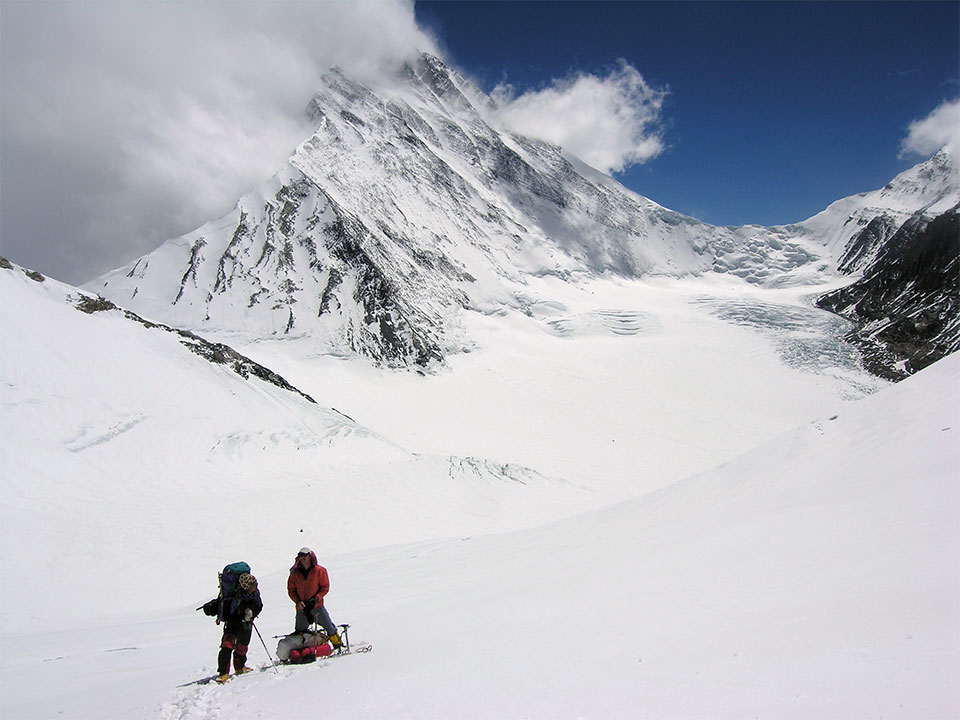 Scott Woolums and Phura Gyelu climbing on Lhakpa Ri; Everest in the background and North Col is the saddle - photo by Jamie