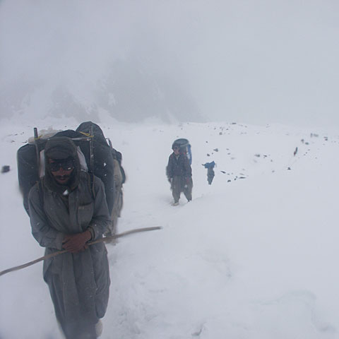 The worry for me (Jamie) was the porters had been given an equipment allowance, rather than the socks and sunglasses, and of course few had sunglasses, but they all had friends coming down the trail who would soon enough be out of the snow, so now at camp about 60% of them have battered glasses. We have a few tender eyes, but no real snow blindness - yet. It is frustrating to be in the middle knowing this would happen (it was obvious from the weather forecast way back in Skardu) but being unable to persuade the guide, sirdar or porters of the need. The general attitude is happy-go-lucky rather than meticulously organised. Tomorrow will be the biggest test for our porters, it is a long 6-7 hours in good conditions and then they will race back down to Goro II, having left all their supplies here. With a good guide (Jalal) we have faired far better than any other expedition we have met, we have all our gear with us and the majority of food (fresh food to be brought up later), and are moving at a pace we want. Roland's Broad Peak mixed team have climbing equipment scattered from Askole to Urdukas and this morning their porters refused to leave Goro II camp so we will share the trail with them tomorrow, if the weather is kind. 26 June - to Broad Peak Base Camp 4825mLight snow was falling but this didn't stop our porters who just wanted to get up and dump their loads. A few had to stay back due to various ailments but according to the sirdar we still had 108 (!) loads.