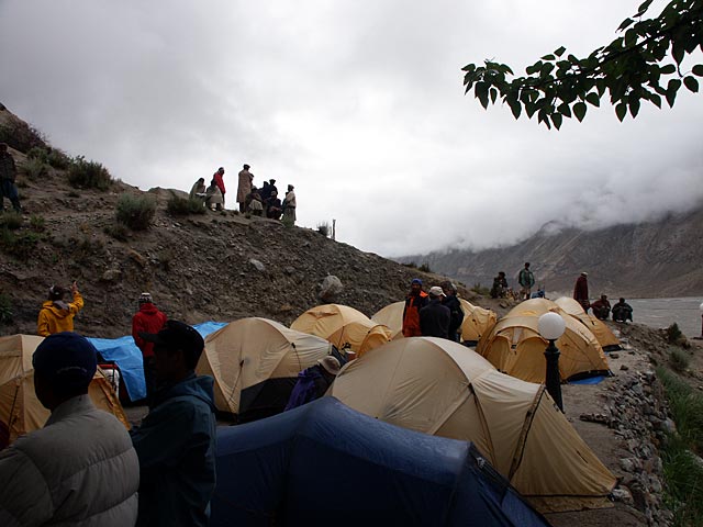 Finally at 8:30 after many anxious scans of the dull clouds I (Jamie) thought it wouldn't rain heavily again - a bit of a gamble, but one I was fairly confident of. So I gave the all go, and then it was up to the porters - the final say. They were keen, mainly because they don’t want to waste time, rather get back down ASAP to pick up another expedition team. We are three days ahead of the Field Touring itinerary and the climbers and porters are happy. It was time for good byes as the GII team were staying a second day at Paiyu with a couple of people still noticing the altitude, minor sickness, and a tough decision for Mathieu. He had bad diarhhoea and wasn’t sleeping well but the real reason he was contemplating turning back was probably more to do with the realization that expedition hardships don’t get any easier with age, he began trekking back to Skardu today with their liaison officer. On the trail the drizzle never turned to rain (luckily!) and by the time we reached camp it had stopped, although we still didn’t get any views. Damn, no Trango towers. We haven’t seen any mountains yet on this supposedly most spectacular of walks. Ian and Sue both remarked how clean the campsites are; in years gone by the camping places were surrounded by "brown Mr Whippy's", logs of occasionally outrageous size, brown porridge and pink paper flowers. Now all the camp sites up to Urdukas have many toilets, sinks and even solar lighting, all looked after by a camp manager - a huge improvement. These camps were built last year by an NGO (non-Government organisation). 25 June, Goro II campLast night the fog looked ominous, and sure enough it was snowing the morning but for our porters, at least, were past the point of no return and to surprised cries of "what, we are trekking in this?", our 100 or so porters descended to pick up the loads. |
