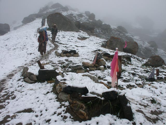Several porters paused to pray passing porter's graves leaving Urdukas campsite |