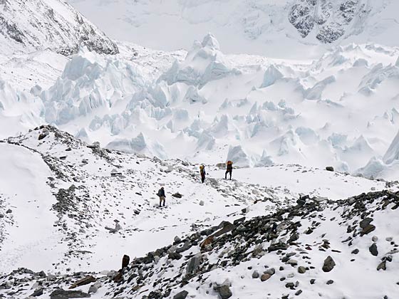 The trail from ABC to Depot camp passes around the side of these ice pinnacles. Normally the trail is snow-free, but not this time! 29 April - ABC preparationToday everyone prepared for tomorrow and our big acclimatization trip on the mountain. Rather embarrassingly only today we discovered that one of our ABC tents is unoccupied, and has been unoccupied since it was put up four days ago! © Jamie McGuinness - Project-Himalaya.com - 2004 |