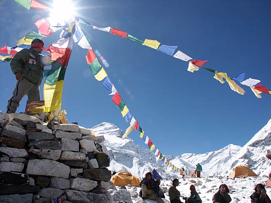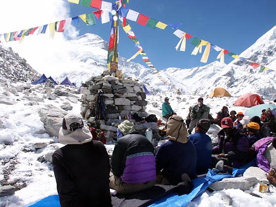 Advanced Base Camp & the Pujaacclimatising and showing respect for the mountain humour returns27 April - ABC - 5700mIt stopped snowing sometime in the early morning and we awoke to a wonderful clear day. Usually ABC is snow-free, with just the occasional dusting, however this time there is snow lying around.