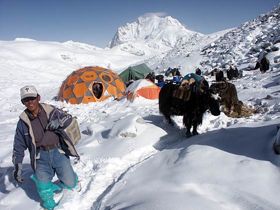 After the puja, and after lunch we headed up to take light loads to Depot camp (which I have also called Lake camp and half camp previously). The 3 climbing sherpas plus Topke raced up and our team all went well, with the slowest taking 3 hours up (including breaks). We returned in light snow. Patrick, the diabetic found his sugar levels getting dangerously low but fortuitously Karsang brought up a thermos of juice half an hour above camp which helped solve the problem. Patrick had of course been monitoring his levels but there comes a point where food no longer helps and juice or coke etc are much faster acting.