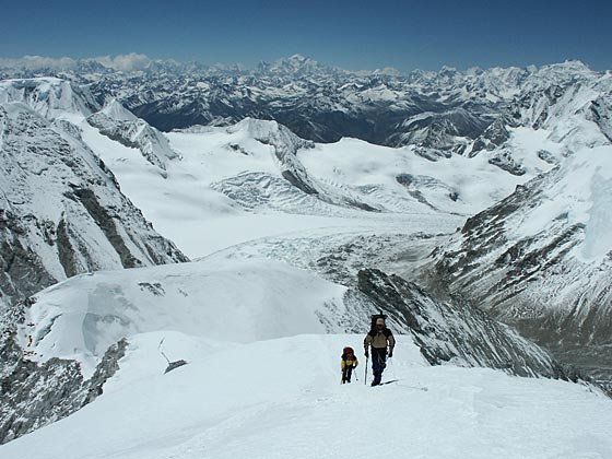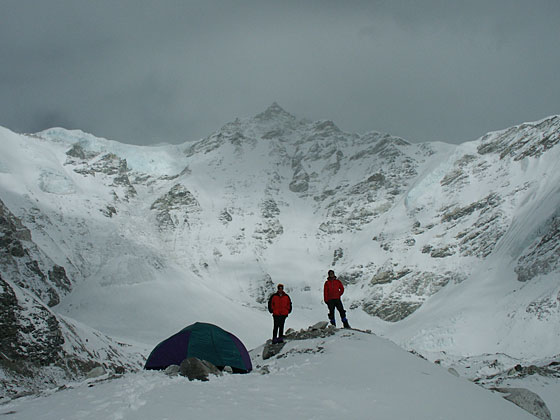 Thomas and Dawa climb well above C1 along the broad ridge. In the center at the back is Shishapangma, the 14th highest peak. 4 May - at C1.5Did anyone sleep? Luckily Jamie put in one extra day of rations, as it was so windy that the sherpas couldn't climb up with more supplies. Catherine and Georgia had a brief moment of panic when one of the tent guy lines snapped, but Clive and then later Jamie effected repairs. 5 May - return to ABC"Going down is easy", but with a calm early morning turning windy (again), we packed hurriedly and battled down. The down rope we had planned to use was too tight and Clive sorted out a second rope for the 15m abseil over the serac. We met several teams all heading up in the gale hoping for a window of good summit weather over the next couple of days. At Camp 1 we met Mary and Warwick who after 4 nights there were a little stir-crazy. Jerry stayed only one night there, instead braving egg dinners and wind at ABC. 6 May - decision dayGeorgia had been contemplating returning to the USA and tomorrow, she will head down. Although strong on the mountain the steep sections scared her and she still felt that she had little summit chance and would be better heading back to work. Warwick found out his father is critically ill and has been for almost two weeks and will return ASAP to Australia. He will be missed. Consequently Jamie is heading down with them and so the dispatches will be back in a couple of days, probably. Everyone else is well, bar a minor tummy problem, and will relax in ABC for at least 7 May, and probably 8 May. The Explorers Web forecast is for extreme winds at the summit level of Cho Oyu for possibly a week, although several teams will still try to summit in the wind in the next couple of days. © Jamie McGuinness - Project-Himalaya.com - 2004 |