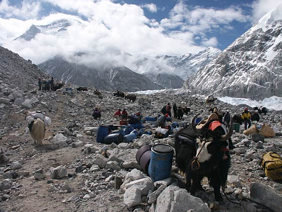 Cho Oyu clouds over and the weather looks unstable but it would be hard to guess that in 3 hours it would be snowing hard The sherpas started packing at 5:30, we partially dried the tents at 7am and the climbers left at 8:30. The sherpas and yaks weren't far behind, but but lunch time at Gyabla (our Intermediate Camp on the way up) where the truck met the yaks there was already 4 inches of snow; the tropical storm was finally kicking in.