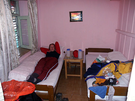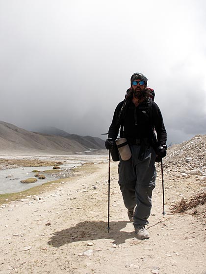Moe nearing BC, the storm chasing behind; With a jeep breakdown we only made it to Tingri, but the food was great! And everyone is grateful we made it out of ABC. 20 May - to TatopaniToday is the last day of the Maoist strike so we know that we will only make it over the Nepal border, not to Kathmandu. It is a grey day, probably still snowing at ABC?