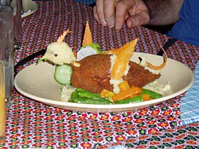 KathmanduMany of the team arrived early in Kathmandu; Jamie didn't count on full Easter flights, but that gave plenty of time for getting sick and recovering. We ate at the best restaurants, Indian, Thai, pizza... great food but at this time of year the bugs are prolific. Photo: the phoenix of death for Warwick, Chicken Kiev, that resulted in a night's food poisoning. Thomas booked locally after the Annapurna Circuit and climbing instruction on Island Peak bringing our team to nine. SightseeingMountain-biking revealed the real Kathmandu Valley, only one spill, a wonderful day and a chance to stretch the legs. We left Kathmandu via Bodhanath and Bhaktapur, below, for some traditional sightseeing.