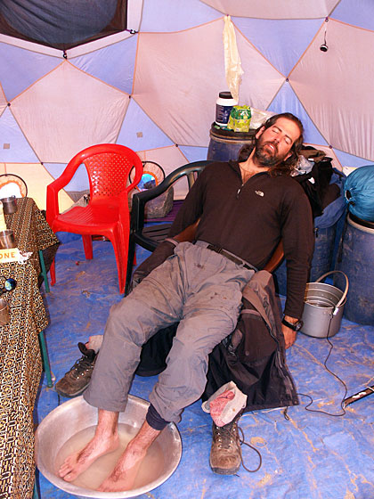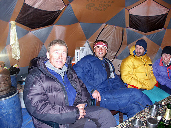 Back in ABC - HumbledThe Ukrainians come for drinks We meet some real climbers17 May - ABCWalking past the Ukrainian's small camp - they are only two - one asked me if I wanted champagne. Sure, but join us after dinner, and they did. Clive, making small talk asked what had they climbed before. Sergey was on the 1989 traverse of the Kanchenjunga peaks (ie all over 8000m), one of the most formidable high altitude mountaineering feats of all time - holy @#$%! He was also on the 1982 Everest new route expedition (the south-west face?), Annapurna South Face, AND the 1990 Lhotse South face expedition, summitted them all. WOW! Igor's feats got lost in all this, but as he made "champagne" and had a seemingly endless supply, this didn't matter!