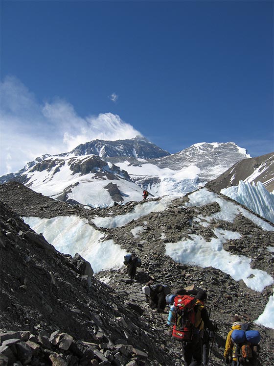 Mr Yak and Mr Moe. Late in the afternoon we saw a Chinese member being carried down by some Tibetans, although we offered a doctor and oxygen, they carried on down losing altitude quickly - we hope quickly enough. 17 April - ABCWe made it, everyone! Which is better than in 2003 when two of the Irish team had to camp on the way. The sun hit our tents around 6am and we hit the trail around 8am, breathing hard.