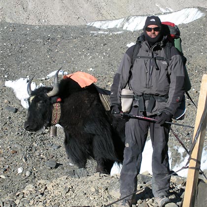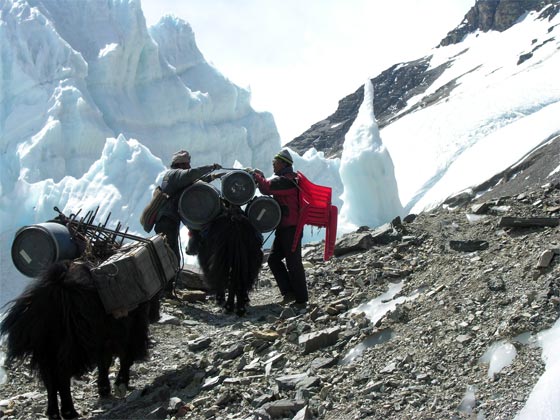 To ABC!Hard yakka up We arrive at ABC beat but happy to be here, and comfortable too 16 April - Interim Camp 5782mWe were up early packing before the sun hit, and the final weight was 1440kgs of gear to take to ABC - yep, that is 3168 pounds, the weight of an average small car. Except that there is no road, so on the backs of yaks it went, all 26 of them. We also shouldered decent loads, our clothing and gear for the 2 day trek up, Jamie the computer system and Julian, appropriately, one of the med kits. The crew, Julian and Jamie cruised up to Interim camp where we set up tents, Moe and Sukhi taking it more slowly arrived later once everything was set up - very sensible!
