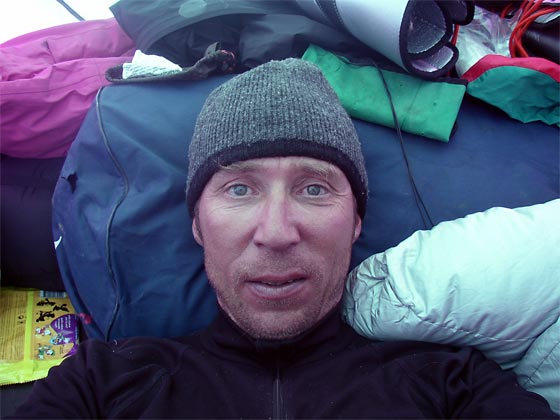 A self-portrait; Paul's first night was rough but the second good Paul is now back at ABC; Julian and Jamie are contemplating going up, in which case there will be no dispatches for two days. The weather does not seem good enough to attempt the summit. Instead we are keeping fit only. It is likely Dawa, Namgyal and Da'Oangchu will stay at North Col as well and try to take the last loads to 7700m and 8300m. |