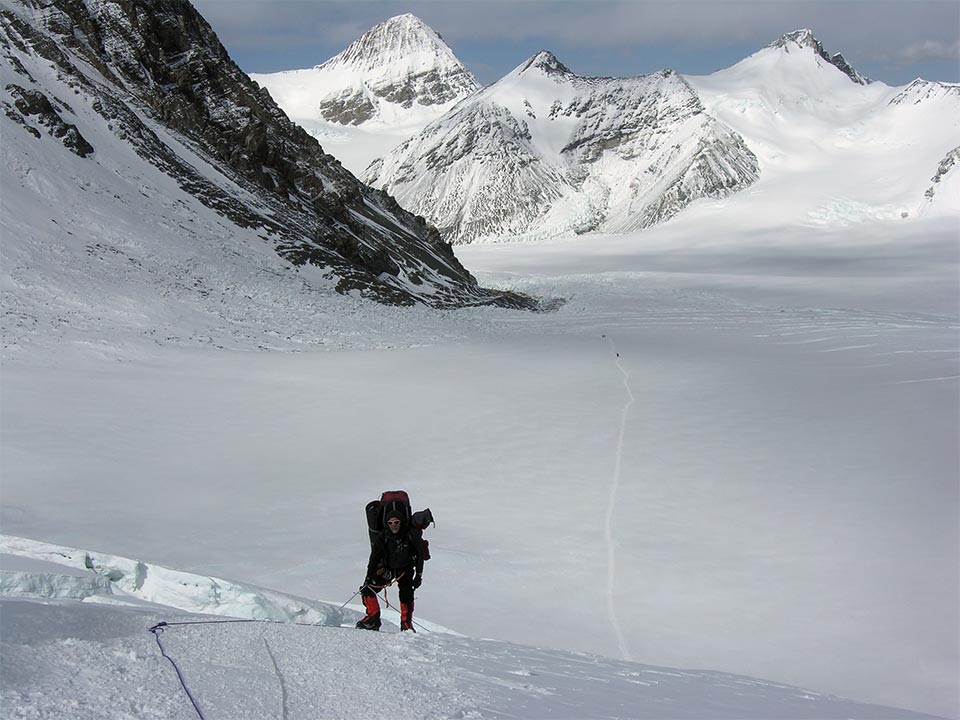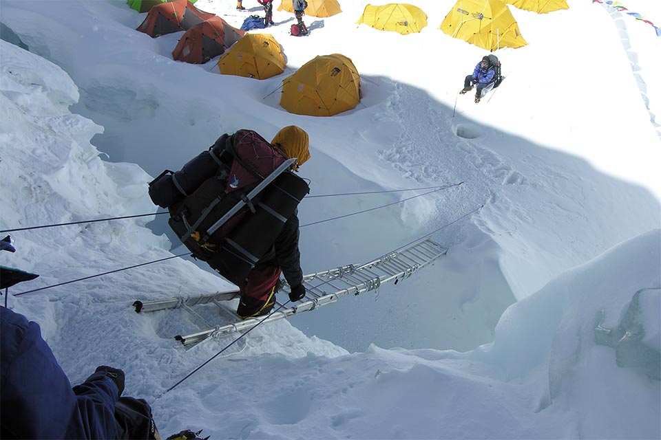 We stayed 3-4 nights at North Col before heading down. Here Ali negotiates several ladders tied together leaving North Col.