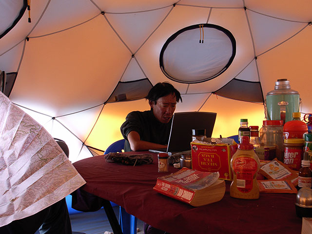 Heading downABC to Kathmandu We are packing and expect the yaks this afternoon. I have added some photos from Dawa's camera to the Down we come page. 6 Oct ABCWhat a leisurely breakfast, Tibetan music ringing around camp and a clear Shishapangma stark white to the south-east. But it is time to go down, we have run out of olive oil to fry eggs, other (still high quality) cooking oil just doesn't taste as good. Also the temperature has changed. It is even colder and although it is hard to see there is real wind on top of Shishapangma, real frostbite climbing conditions. If anyone else summits it will be a tough push. We were the commercial team who climbed the highest so far this season, and of course Iņaki did make the main summit. So we are as successful as can be in the conditions. I don't rule out another summit of the Central or Main summit this season, simply because not all the teams have left yet, The Japanese second team who are preparing for the semi-winter ascent of the South Face of Lhotse should be made of stern stuff - lets see. Here are some photos taken a few days ago, yes, finally some team pictures.