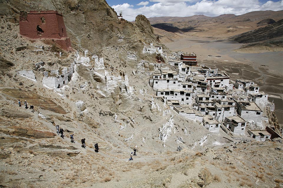 Rising above (old) Shegar which is the administrative headquarters for the county, is the fort, and a gompa in red much lower down - Jamie