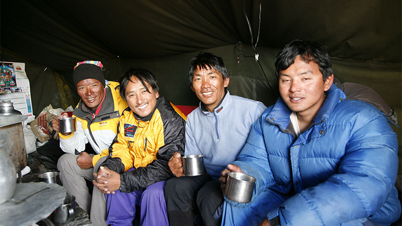 1 June: Pasang Gombu, Namgyal, Mindu and Ngima Chhiri have tea in the morning - Jamie |