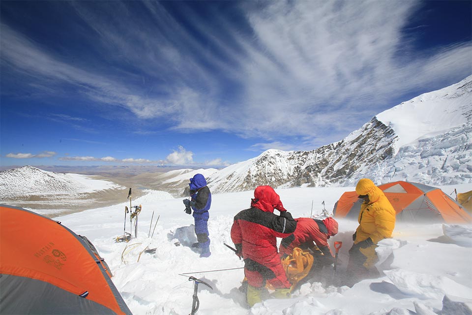 Tristan pulling out Mark's tent with Shishapangma in the background - Jamie |