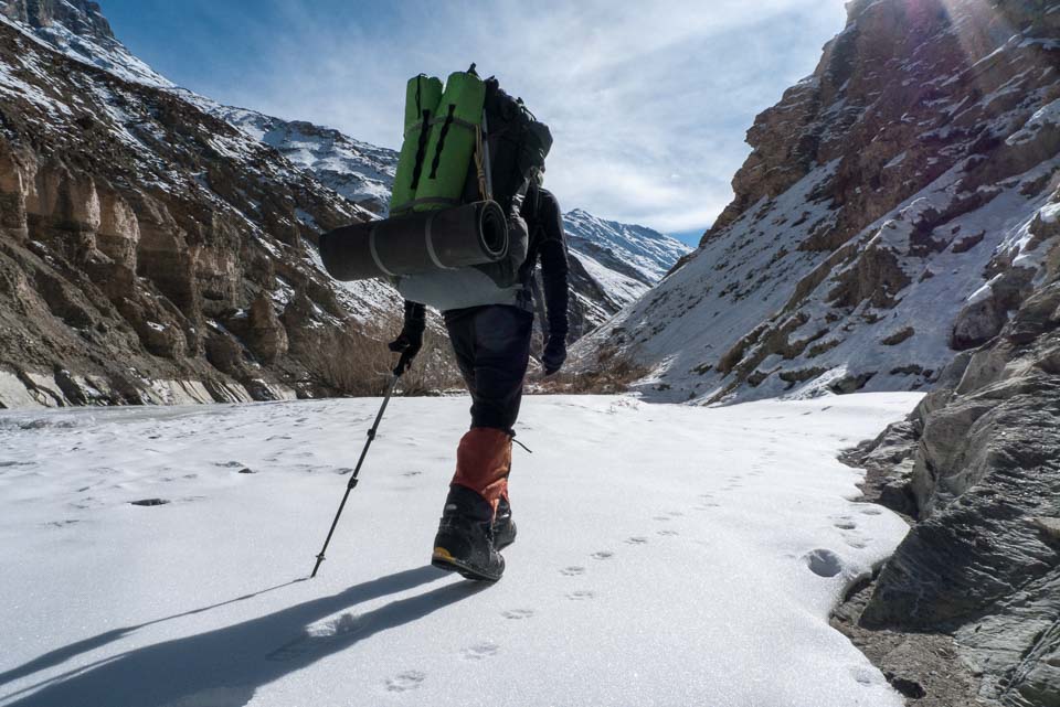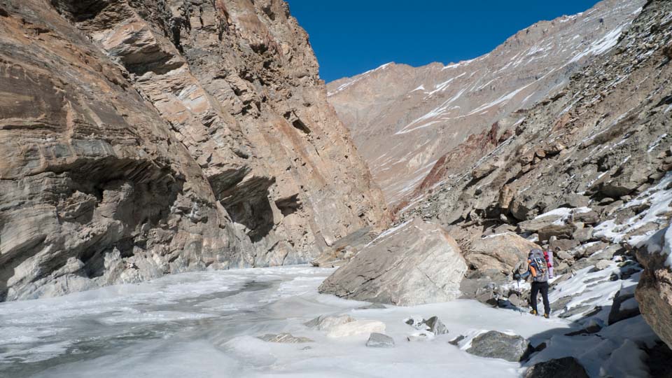 Our unique adventure begins. For the first five kilometers or so we may face particularly tough ice conditions, I did in 2010 but the locals assured me it gets more straightforward after that. Perhaps surprisingly the lower volume river flow makes it harder to traverse than the solid Zanskar ice, however conditions should improve the further in we go as the valley widens out slightly.